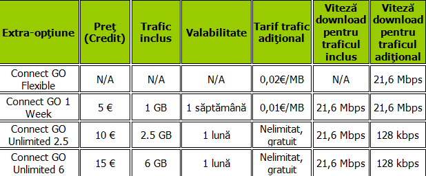 Mai mult, CONNECT GO oferă acces la extra-opţiuni incredibile care pot include până la trafic nelimitat preplătit, în perioada de valabilitate, cu viteze de download de până la 21,6 Mbps. Astfel, CONNECT GO Flexible oferă Internet pentru cei care nu au nevoie permanent de navigare online şi plătesc pe măsură ce consumă, CONNECT GO 1 week este perfect pentru cei care utilizează Internetul atunci când călătoresc, în timp de CONNECT GO Unlimited 2.5 şi Unlimited 6 sunt perfecte pentru cei care sunt mereu online, oferind trafic de Internet nelimitat. Mai jos găsiţi toată gama de extra-opţiuni: