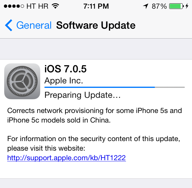 Pana in prezent, utilizatori din China, Statele Unite ale Americii, Germania, Marea Britanie si Croatia au primit notificari privind update-ul la noul iOS 7.0.5, in Romania, inca nu este disponibil updateul.
