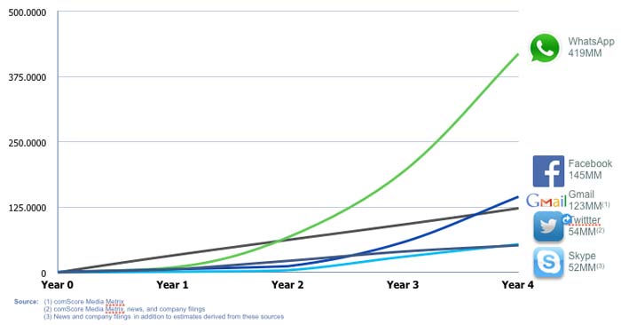 Facebook a platit pentru aplicatia WhatsApp 16 miliarde de dolari, adica 12 miliarde in actiuni Facebook, 4 miliarde de dolari cash si 3 miliarde in RSU, acesta din urma find Restricted Stock Units pentru a motiva angajatii WhatsApp, 55 la numar, sa ramana in companie, suma totala ce va urma sa fie tranzactionata urmand a fi defapt 19 miliarde de dolari. In momentul actual aplicatia se bucura de 400 milioane de utilizatori conectati, dar este intr-o crestere surprinzator de mare, adica doar in India, apar in medie, cate 1 milion de utilizatori noi pe luna, pe cand Facebook detine 1,2 miliarde de utilizatori in total.