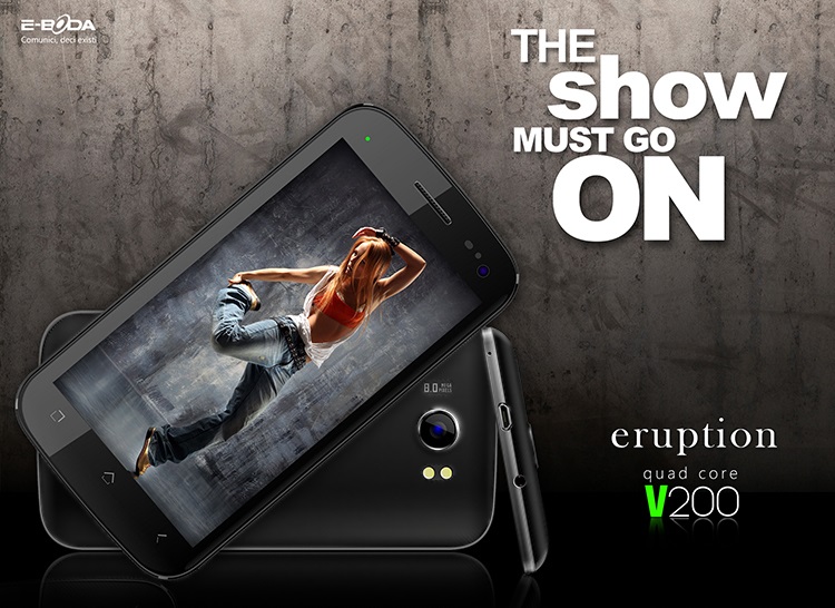 Primul telefon se numeste E-Boda Eruption V200, fiind un quad core dotat cu un procesor MT 6589M tactat la 1.2 GHz. Procesorul este ajutat de 1GB DDR3 de RAM, suficient pentru rularea impecabila a sistemului de operare Android 4.1.2. Display-ul prezinta 4,5 inci qHD cu o rezolutie de 960 x 540. Camera foto principala are 8MP, iar cea secundara 2MP. Telefonul impresioneaza si prin design, el avand o grosime de doar 8,9 mm si cantarind 124g. Trebuie mentionat ca telefonul are doar 4GB memorie interna, dar prezinta posibilitatea de extindere a memoriei printr-un card microSD de pana la 32GB, iar acumulatorul este de 1800 mAh. La capitolul conectivitate smartphone-ul sta foarte bine, avand 3G si Wi-fi.