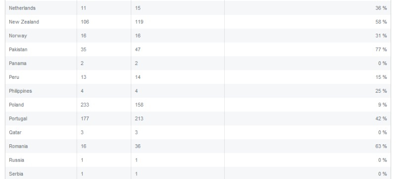 La polul opus sta Romania care a emis doar 16 cereri cu privire la 36 de conturi de facebook, cereri care au fost onorate in proportie de 63%. O surpriza vine din partea Rusiei care are doar o cerere si care nu a fost onorata de Facebook. Desigur, in Rusia cea mai mare retea de socializare este VKontakte si asta poate explica de ce nu ao fost prea multe solicitari.