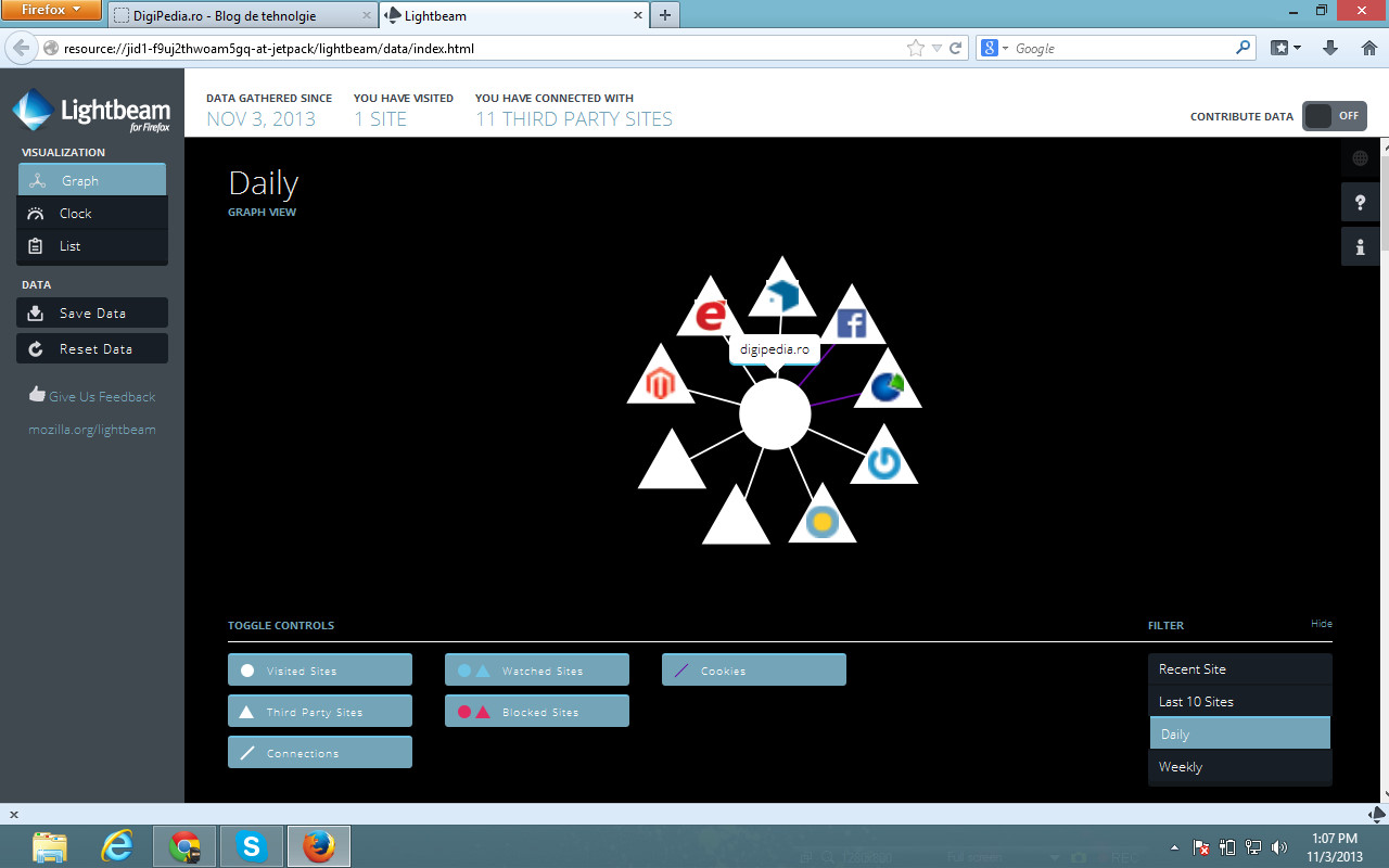 - Mozilla Lightbeam este instalat si utilizabil (nu necesita restart la browser)
