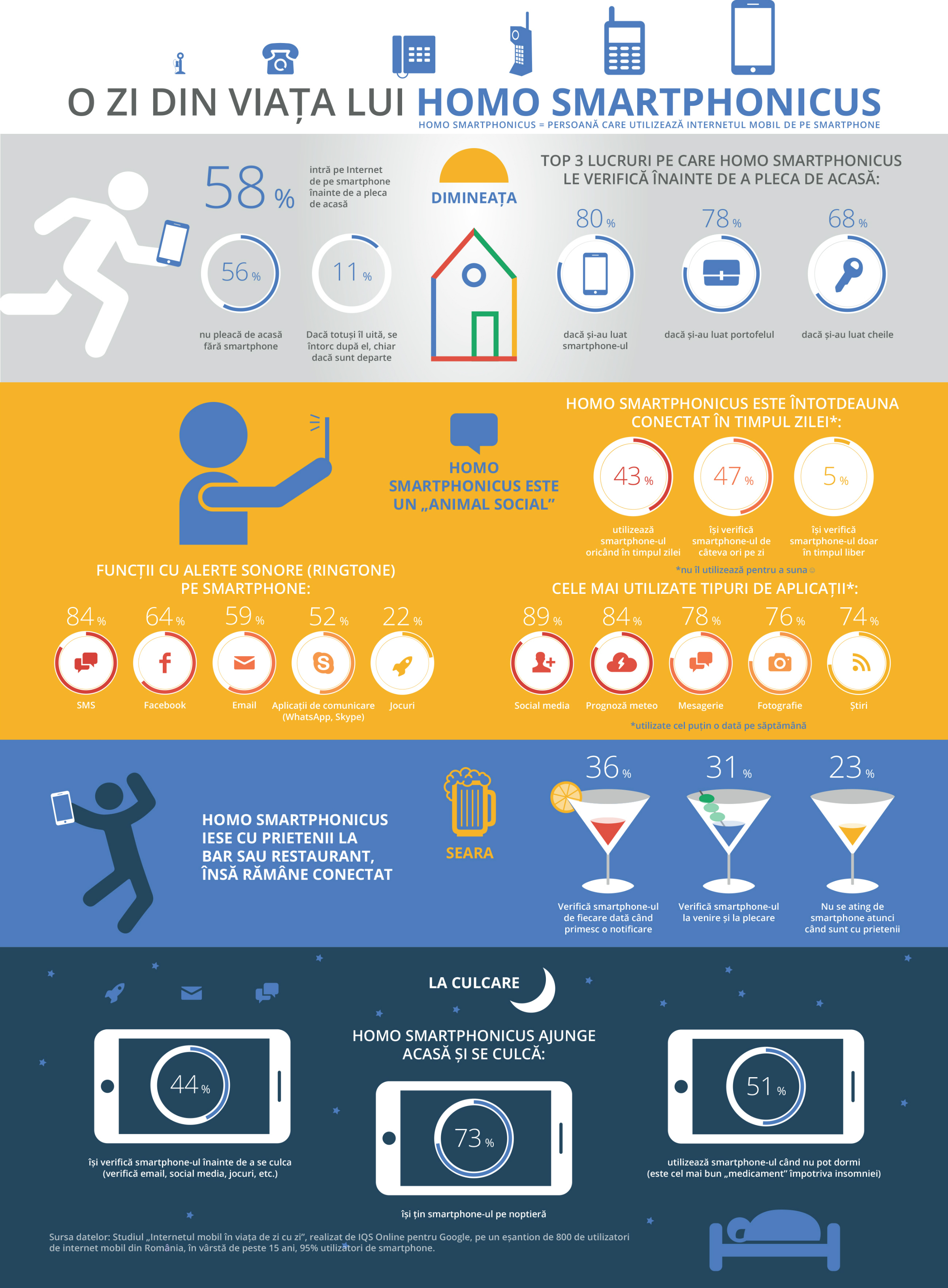 Dimineata unui „homo smartphonicus” incepe cu prima accesare pe internet, un procent de 58% dintre respondenti procedant la fel, iar ca sa facem un top 3, noii utilizatori de telefoane inteligente verifica inainte de a pleca acasa prima data daca si-au luat smartphone-ul, doar mai apoi si alte obiecte, cum ar fi portofelul sau cheile.